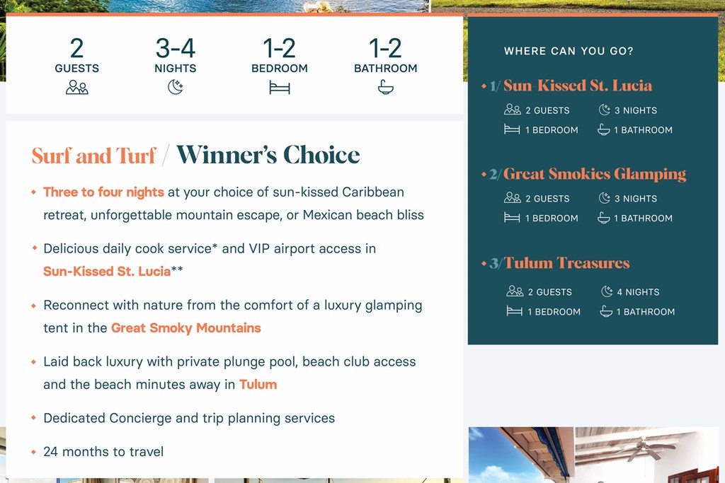 WINNER'S CHOICE Surf & Turf 2 GUESTS 3-4 NIGHTS 1 BEDS 1 BATHS Surf or turf? Take your pick with a selection of stunning experiences from land to sea. Wander the lush rainforests and sun-kissed sands of St. Lucia, discover the ancient Mayan history and snow-white beaches of Tulum, or get back to nature with a glamping stay in the lush forests of the Great Smoky Mountains. No risk experiences Dedicated concierge and travel planning All properties are professionally managed by the best in the business Each property is personally inspected by our team to ensure the highest quality 24 months to travel