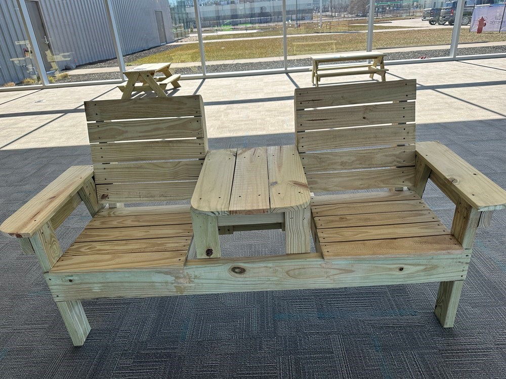 Unfinished double chair with center table built by Muscatine High School.