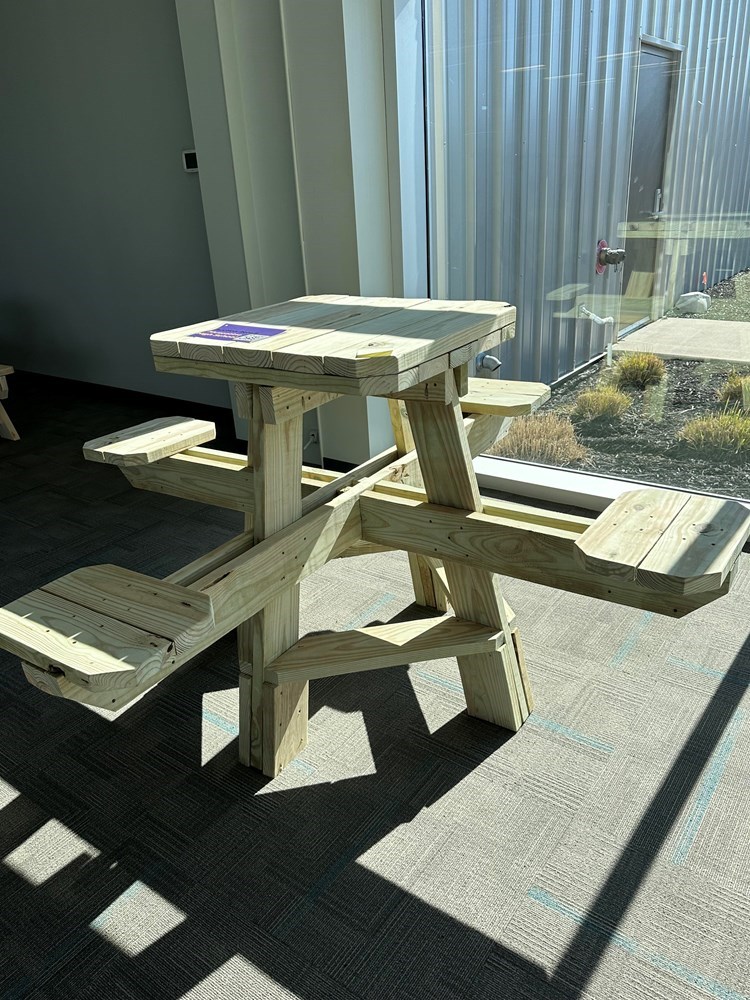 Unfinished high top outdoor picnic table with four seats built by Muscatine High School.