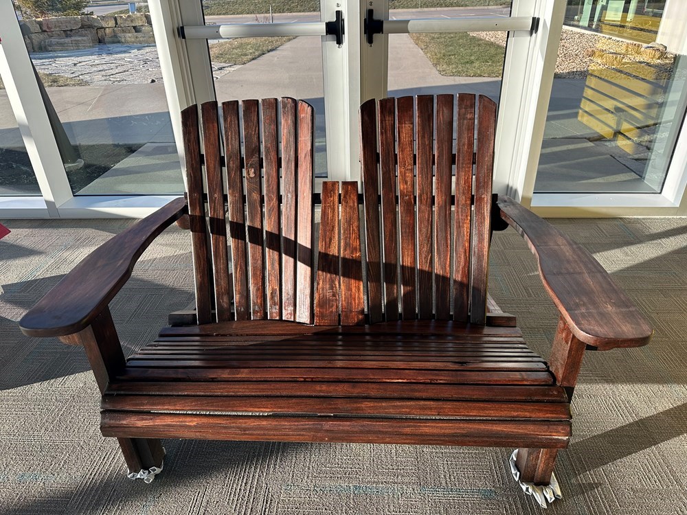 Freshly stained double Adirondack chair. Built by North Scott School.