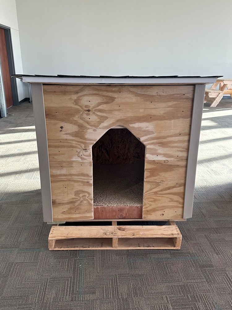 Fully insulated and roofed large doghouse. Slightly damaged during delivery. Repairs will be made by donating High School. Built by North Scott School.